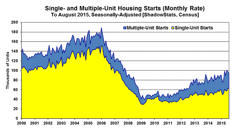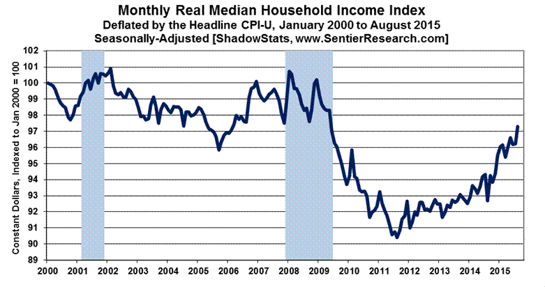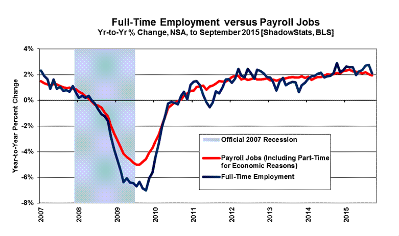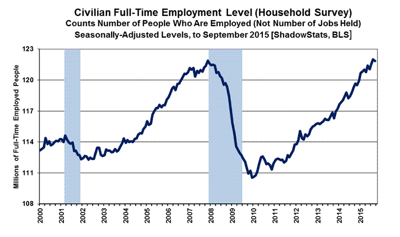 Again, when the headline unemployed become "discouraged," they are rolled over from U.3 to U.6. As the headline, short-term discouraged workers roll over into long-term discouraged status, they move into the ShadowStats measure, where they remain. Aside from attrition, they are not defined out of existence for political convenience, hence the longer-term divergence between the various unemployment rates. The resulting difference here is between headline-September 2015 unemployment rates of 5.1% (U.3) and 22.9% (ShadowStats).