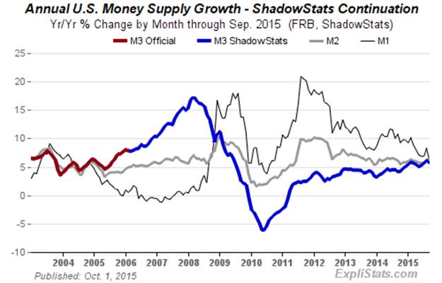 Money Supply M3 Annual Growth Tentatively Eased Back to 5.7% in September, versus a 6.1% Gain in August 2015. Year-to-year growth in September 2015 M3 (ShadowStats-Ongoing Measure) fell to 5.7% from an unrevised 6.1% in August 2015, but still was up from an unrevised 5.6% in July, an unrevised 5.2% annual gain in June 2015 and a near-term trough of 5.0% in May 2015. Any revisions seen in the accompanying data generally are due to frequent, regular and irregular benchmark revisions by the Federal Reserve to the underlying, seasonally-adjusted monthly detail.