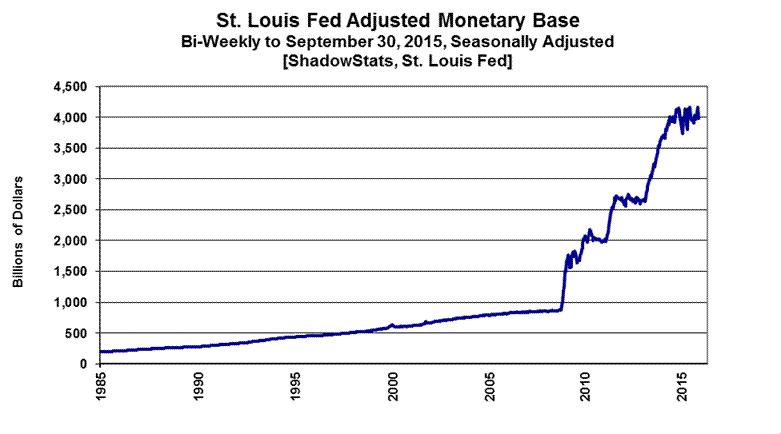 September M3 Growth Slowed Sharply Year-to-Year, Declined Month-to-Month for First Time Since January 2011; Monetary Base Had Largest Two-Week Tumble Since July 2009. Late in 2014, the Federal Reserve ceased net new purchases of U.S. Treasury securities as part of its quantitative easing QE3, but its holdings of Treasury securities have remained relatively stable, near record levels. Despite relative stability also in the monetary base during the last year—plus-or-minus 5% around the St. Louis Fed’s estimated 12-month average of $4.0 trillion, the latest (September 30th) two-week average just tumbled by 4.4% (-4.4%), or down at an annualized pace of 69.1% (-69.1%), its largest bi-weekly drop since the formal trough of the economic plunge in July 2009.