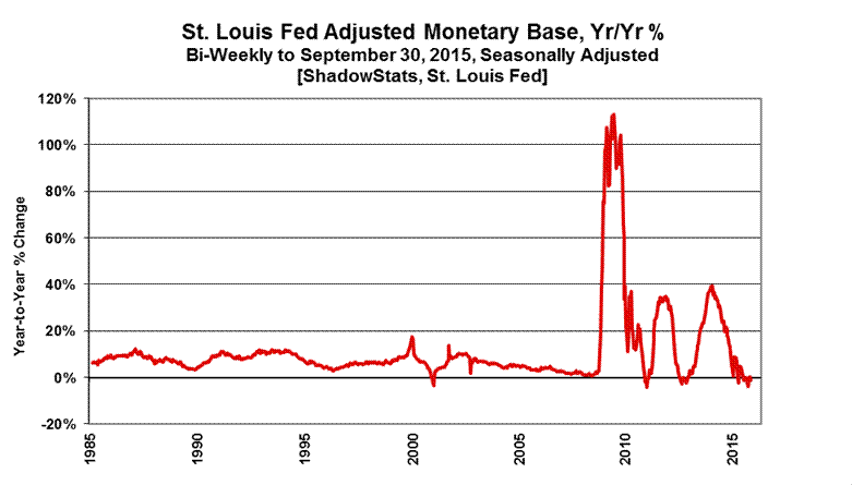 That said, discussed in the Monetary Conditions section of the Hyperinflation Watch, unusual weakness was seen the ShadowStats Ongoing Estimate of Money Supply M3 for September 2015, along with an unusually steep hit to the latest estimate of the monetary base. If one looks at M2 as the broadest measure of money supply growth, it still is growing both month-to-month and year-to-year, put the picture changes if the view shifts to the former-broadest measure, M3. Annual growth in M3 dropped sharply to 5.7% in September, down from the 6.1% peak growth seen in August 2015, then the strongest reading since June of 2009. On a month-to-month basis, September M3 declined for the first time since January 2011.