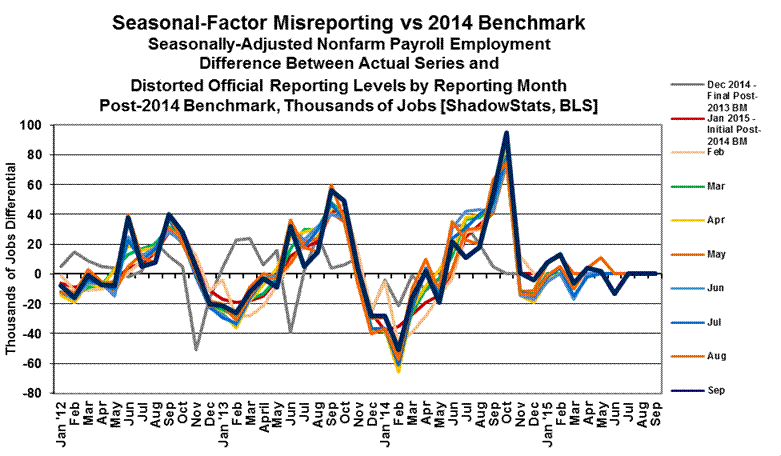 If the headline reporting were comparable and stable, month-after-month, all the lines in the graph would be flat and at zero. Here, with the payroll series, again, only the headline month and the prior month are consistent in terms of month-to-month reporting detail (headline August 2015 detail no longer is neither consistent nor comparable with data from July 2015 or earlier). Comparable with headline September and August reporting, July’s current headline jobs gain of 223,000 was understated by 13,000 (up by 235,000 on a consistent basis), while the gain for June 2015 is headline at 245,000, such now is 230,000, consistent with the September 2015 detail. Monthly discrepancies have been as large as 100,000 jobs (see the earlier section Inconsistent, Non-Comparable and Deliberately-Misstated Monthly Changes).