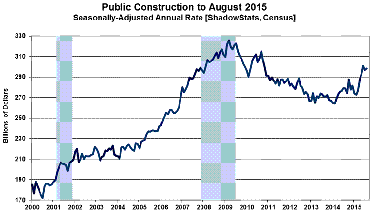 Graphs 7 to 10 show comparative nominal and real construction activity for the aggregate series as well as for private residential- and nonresidential-construction and public construction spending. Seen after adjustment for inflation, the aggregate series had remained in low-level stagnation into first-quarter 2015. It spiked in recent months, but slowed in the last several months of reporting, with the real series in August 2015 still holding at 28.0% (-28.0%) below its pre-recession peak of March 2006. The general pattern of real activity remains one of low-level, albeit up-trending stagnation.