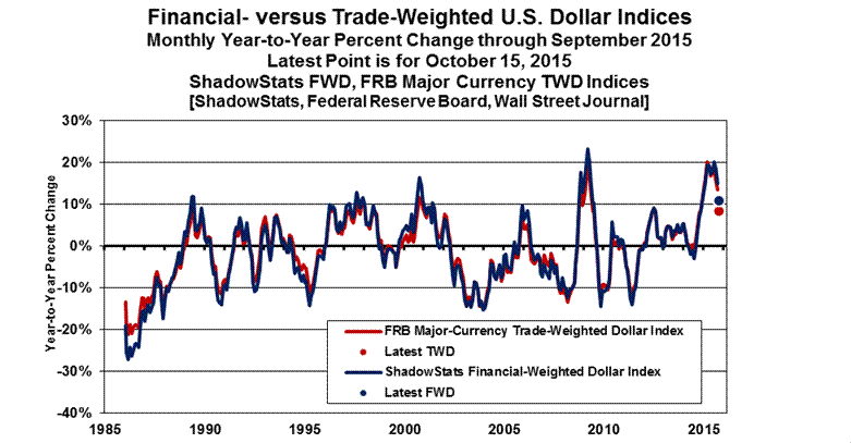 Once again, allowing for the earlier CPI methodologies, actual year-to-year consumer inflation is not close to flat, minus or the headline "zero" of September 2015. The ShadowStats Alternate Inflation Measures—designed to reflect inflation as it would have been before various redefinitions—was at 3.5% annual inflation in September, based on 1990 methodologies, and at 7.6% in September, based on 1980 methodologies. These areas are discussed in Public Commentary on Inflation Measurement.