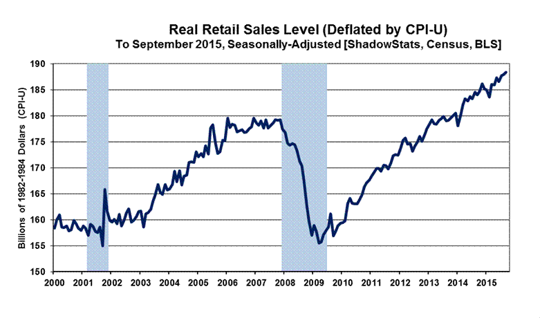 Corrected Real Retail Sales—September 2015. The apparent "recovery" of headline real retail sales shown in Graph 1 generally continued into late-2014, although headline reporting turned down in December 2014, into first-quarter 2015 and has turned higher, again, into third-quarter 2015. Nonetheless, headline real growth in retail sales continues to be overstated heavily, due to the understatement of the rate of inflation used in deflating the retail sales series. Discussed more fully in Chapter 9 of 2014 Hyperinflation Report—Great Economic Tumble – Second Installment, deflation by too-low an inflation number (such as the CPI-U) results in the deflated series overstating inflation-adjusted economic growth.