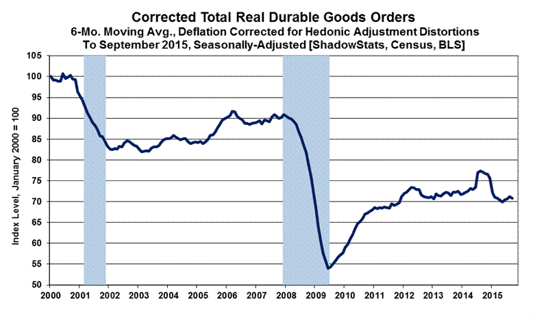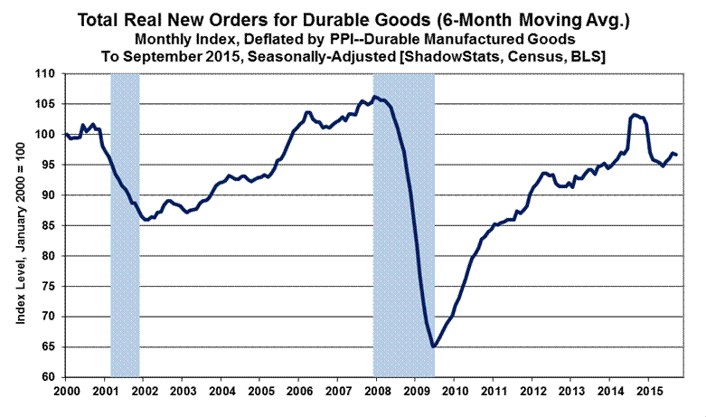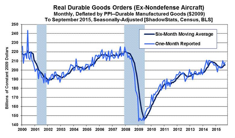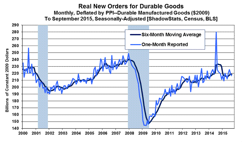 Real (Inflation-Adjusted) Durable Goods Orders—September 2015. ShadowStats uses the PPI component inflation measure “Durable Manufactured Goods” for deflating the new orders for durable goods series. Published only on a not-seasonally-adjusted basis, the related September 2015 PPI series contracted for the eighth straight month, down by 0.06% (-0.06%), following monthly declines in August of 0.24% (-0.24%) and in July of 0.12% (-0.12%). Headline annual inflation contracted at a negative year-to-year pace of 0.48% (-0.48%) in September, the same pace of annual contraction as seen in August 2015, following a headline annual contraction of 0.18% (-0.18%) in July 2015.