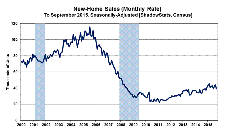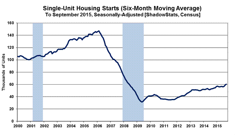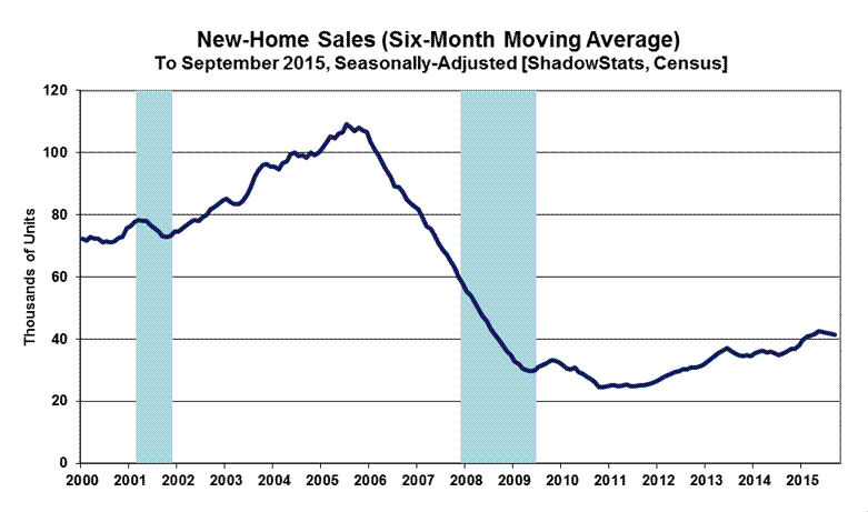 ShadowStats assesses such unstable series by considering the gyrations in monthly activity in the context of a six-month moving average of the headline numbers. Today’s Opening Comments section includes the regular graphs of the September 2015 headline-monthly and smoothed detail for new-home sales, as well as comparative graphs of single-unit housing starts and existing-home sales.