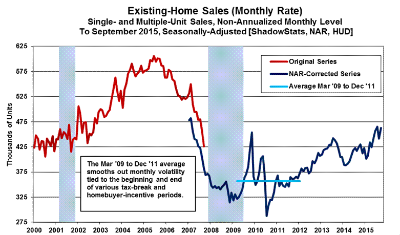 ShadowStats assesses such unstable series by considering the gyrations in monthly activity in the context of a six-month moving average of the headline numbers. Accompanying graphs of the September 2015 headline-monthly and smoothed detail for new-home sales, as well as comparative graphs of single-unit housing starts and existing-home sales follow at the end of this section.