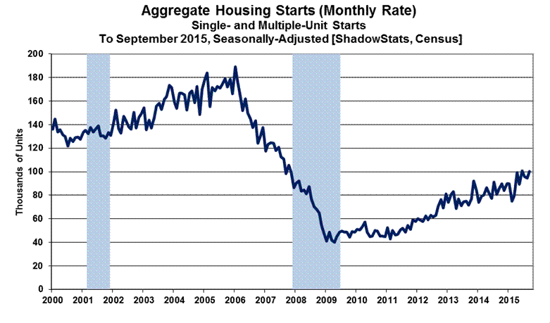 Existing-Home Sales Rose by 4.7% in September, Still Down 23.7% (-23.7%) from Pre-Recession Peak. In the context of the fourth consecutive downside revision to the prior month’s initial reporting of sales activity, September 2015 existing-home sales rose by 4.7% in the month, to an annualized 5,550,000 million units, or 462,500 units at a monthly pace as reflected in the ShadowStats graph. That still was off the July 2015 near-term peak for the series, and it remained down by 23.7% (-23.7%) from the June 2005 pre-recession sales peak. In contrast, the September 2015 headline aggregate monthly housing starts remained down by 46.9% (-46.9%) versus its January 2006 pre-recession peak.