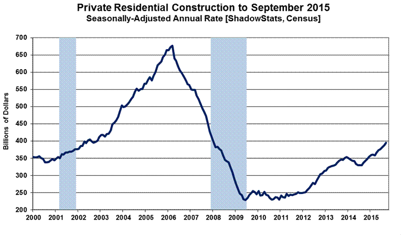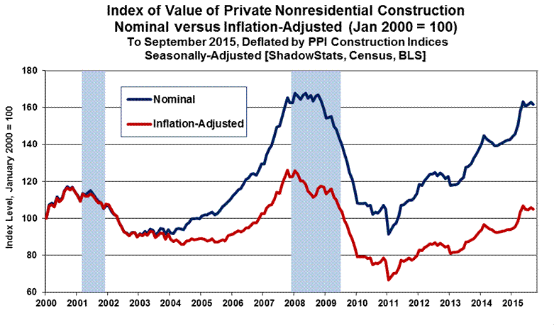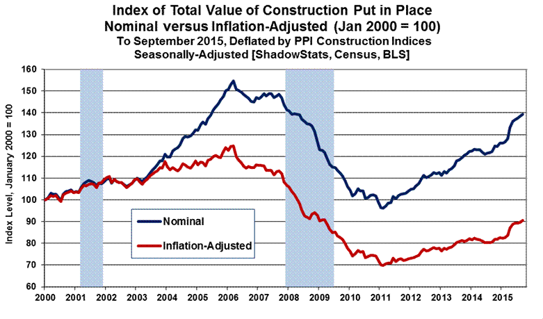Construction and Related Graphs. The earlier Graphs 9 and 10 reflected total construction spending through September 2015, both in the headline nominal dollar terms, and in real terms, after inflation adjustment. The inflation-adjusted graph is on an index basis, with January 2000 = 100.0. Adjusted for the PPI’s NCI measure through October 2009 and the PPI’s Final Demand Construction Index thereafter, real aggregate construction spending showed the economy slowing in 2006, plunging into 2011, then turning minimally higher in an environment of low-level stagnation, trending lower from late-2013 into mid-2014 and in a low-level uptrend into 2015, with a recent spike that now is slowing somewhat.