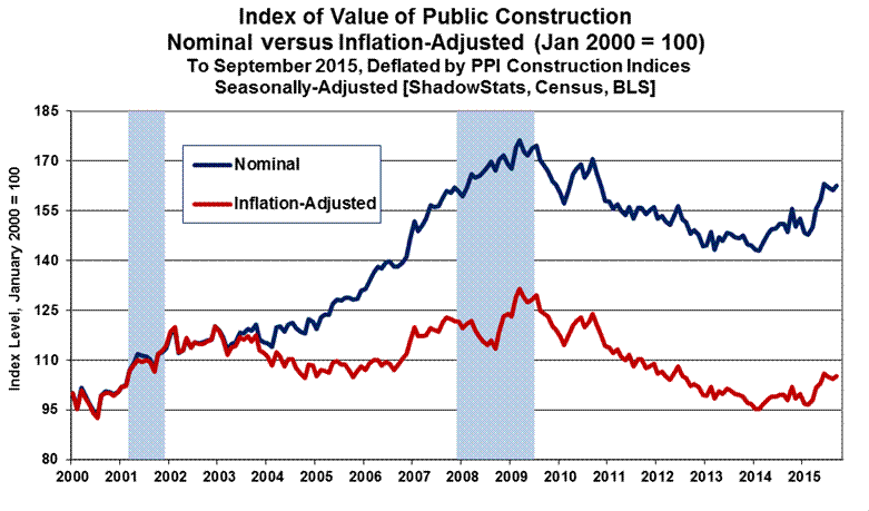 Graphs 2 to 5 in these Opening Comments show comparative nominal and real construction activity for the aggregate series as well as for private residential- and nonresidential-construction and public construction spending. Seen after adjustment for inflation, the aggregate series remained in low-level stagnation into first-quarter 2015. Activity spiked in recent months, but slowed again in the last couple months of reporting, with the real series in September 2015 still holding at 27.0% (-27.0%) below its pre-recession peak of March 2006.