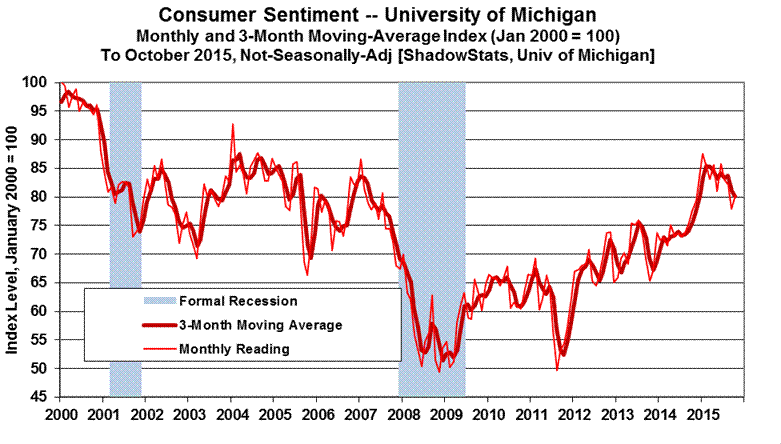 Consumer Conditions—Full-October Sentiment and Confidence Surveys. Updating the detailed review of consumer liquidity circumstances in Commentary No. 758, and related brief updates found in Commentary No. 759 (real earnings), Commentary No. 760 and Commentary No. 762, this section reviews and graphs the full October 2015 detail on the University of Michigan’s Consumer Sentiment measure and the Conference Board’s Consumer Confidence measure (initially covered in No. 762).