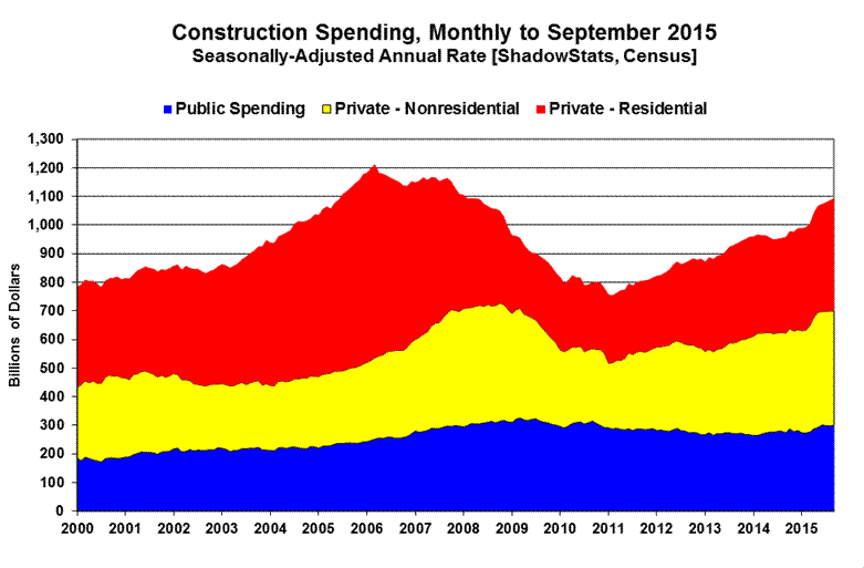 On a year-to-year or annual-growth basis, September 2015 nominal construction spending rose by a statistically-significant 14.1% +/- 2.5%, versus a revised annual gain of 13.9% [previously up by 13.7%] in August 2015 and a revised annual gain of 13.4% [previously up by 13.2%, initially up by 13.7%] in July 2015.