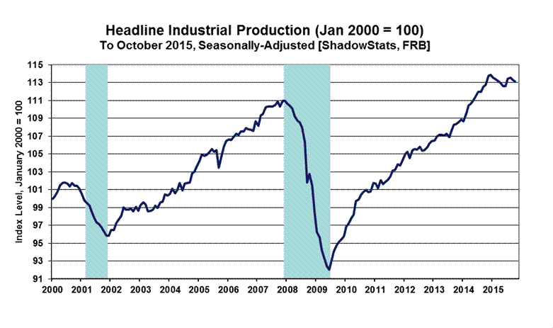 An upside revision to the level of August activity accounted for the bulk of the boosted, headline second-quarter activity. As a result, net of prior-period revisions, the headline monthly October gain was 0.11%, close to market expectations. Yet, the revisions shifted weakening production activity into the present, with monthly activity dropping off sharply in September and October 2015, and with suggestions of quarterly and annual contractions in activity being imminent. If November 2015 production activity does not gain more than 0.5% month-to-month, relative to current headline October production, annual and quarterly contractions effectively will be locked in for fourth-quarter 2015.