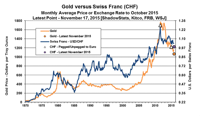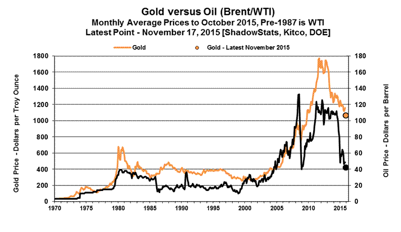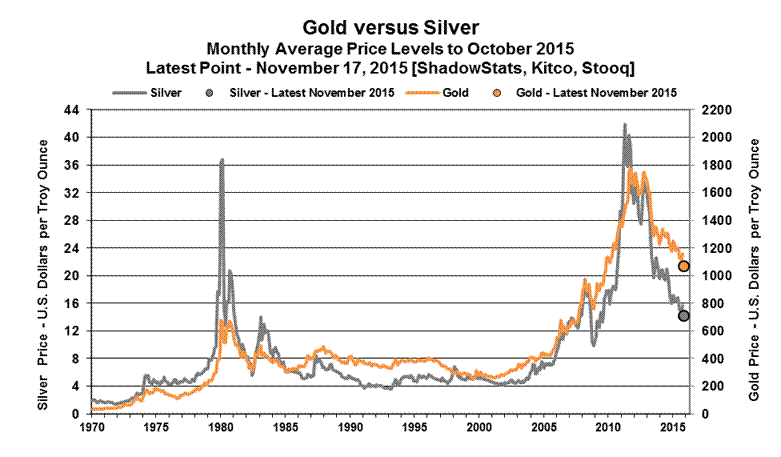 In like manner, the all-time high nominal price for silver in January 1980 of $49.45 per troy ounce (London afternoon fix, per silverinstitute.org)—although approached in 2011—still has not been hit since 1980, including in terms of inflation-adjusted dollars. Based on October 2015 CPI-U inflation, the 1980 silver-price peak would be $151 per troy ounce and would be $711 per troy ounce in terms of October 2015 ShadowStats-Alternate-CPI (1980-Base) adjusted dollars (again, all series not seasonally adjusted).