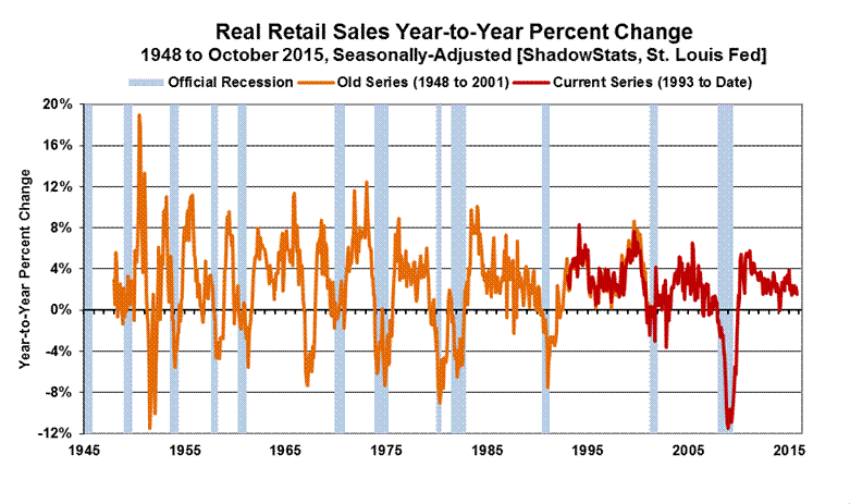 Real Retail Sales—October 2015—Intensified Recession Signal; Suggestion of Fourth-Quarter Contraction; Monthly Contraction of 0.2% (-0.2%). Not adjusted for inflation, headline nominal retail sales rose by 0.05% in October 2015, following a downwardly-revised contraction of 0.02% (-0.02%) in September 2015, as detailed in Commentary No. 766 of November 13th. Year-to-year October 2015 nominal retail sales growth slowed to 1.69%, following a downwardly revised annual gain in September 2015 of 2.20%.