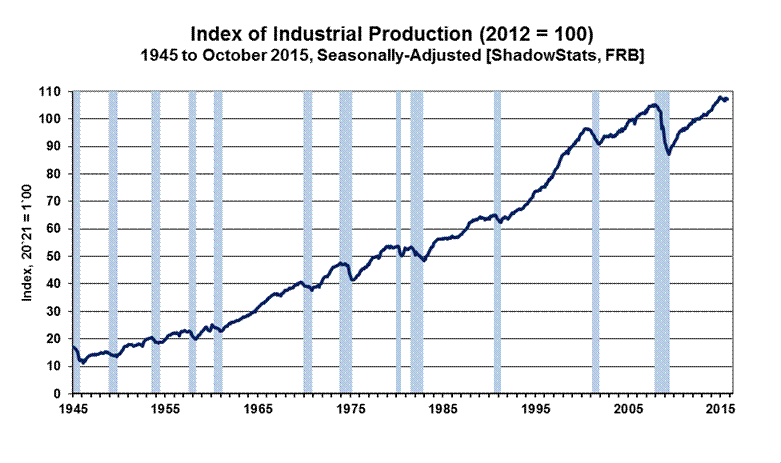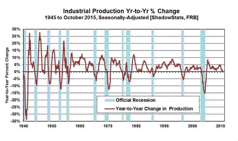 No Good News Here for the U.S. Economy. Today’s (November 17th) headline detail on October 2015 industrial production and real retail sales continued to signal a developing recession, as seen in terms of monthly, quarterly and annual activity. With tomorrow’s release on October Housing Starts, Commentary No. 768 of November 18th will review the major economic releases for October along with assessments as to related headline GDP impact, any shifting economic sentiment in the financial markets, and any shifting sentiment on FOMC activity, etc.