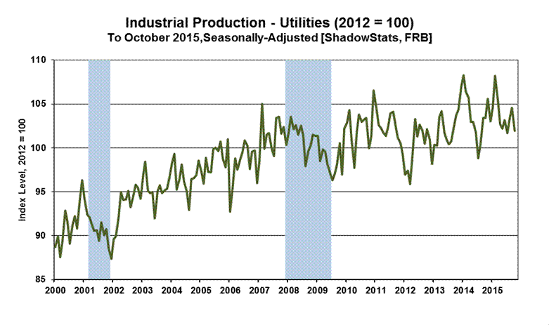 Detailed in Graphs 20 to 23, including major industry groups, the headline October 2015 monthly aggregate production loss of 0.2% (-0.2%) [a September contraction of 0.2% (-0.2%)] was composed of a gain of 0.4% in October manufacturing activity [a September decline of 0.1% (-0.1%)]; an October decline of 1.5% (-1.5%) in mining (including oil and gas production) [a September monthly decline of 2.4% (-2.4%)]; and an October decline of 1.5% (-1.5%) in utilities [a September gain of 1.2%].