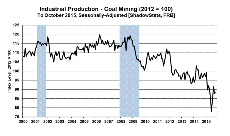 Amidst Indications of a Quarterly Contraction in Production, Deteriorating Annual Growth Held Well Within Recession Territory. With headline October 2015 industrial production reporting in hand, the production series continued to show deteriorating economic conditions, a deepening and intensifying recession. Monthly and annual activity patterns in the first month of fourth-quarter 2015 reporting not only continued to falter in a manner last seen coming into the economic collapse, but also they were fully consistent with an ongoing recession. Shown in Graphs 17 and 19, annual growth in production has declined to a low level rarely seen other than at the onset of or in formal recessions.