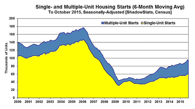 The record monthly low level of activity seen for the present aggregate series was in April 2009, where the annualized monthly pace of housing starts then was down 79% (-79%) from the January 2006 pre-recession peak. Against the downside-spiked low in April 2009, the October 2015 headline number was up by 121%, but it still was down by 53% (-53%) from the January 2006 pre-recession high. Shown in the historical perspective of the post-World War II era, current aggregate-starts activity is in up-trending stagnation at low levels that otherwise have been at or near the historical troughs of recession activity of the last 70 years, as seen in Graph 10 at the end of the Reporting Detail section.