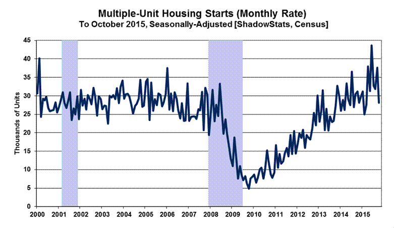 Housing starts for apartment buildings (generally 5-units-or-more) in October 2015 fell month-to-month by a statistically-insignificant 25.5% (-25.5%), versus a revised monthly gain of 16.8% in September and a revised monthly decline of 1.6% (-1.6%) in August. The statistically-insignificant October 2015 year-to-year decline of 8.4% (-8.4%), followed a revised 24.4% year-to-year gain in September 2015 and a revised annual gain of 22.9% in August 2015.