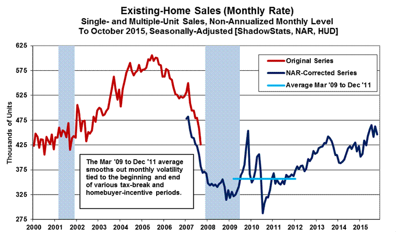 Noted separately in the opening paragraphs of these Opening Comments, the October Existing-Home Sales series has joined the ranks of Housing Starts, Real Retail Sales and Industrial Production series in generating an early signal for a fourth-quarter 2015 GDP contraction. Although the headline GDP and related detail and revisions remain mixed, there is enough sustained and fundamental weakness in the headline monthly economic detail to time this “new” recession from December 2014.