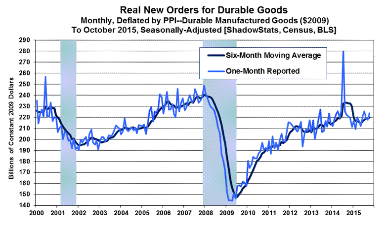 Real (Inflation-Adjusted) Durable Goods Orders—October 2015. ShadowStats uses the PPI component inflation measure “Durable Manufactured Goods” for deflating the new orders for durable goods series. Published only on a not-seasonally-adjusted basis, the related October 2015 PPI series turned to the plus-side month-to-month, having contracted in each of the preceding eight months. The related PPI series rose by 0.12% in October 2015, having been down for the month by 0.06% (-0.06%) in September, and by 0.24% (-0.24%) in October. Headline annual inflation contracted at a negative year-to-year pace of 0.78% (-0.78%) in October 2015, having been down by 0.48% (-0.48%) in both September and August 2015.