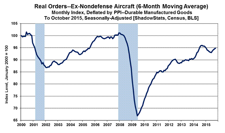 Separately, where related headline PPI inflation for manufactured durable goods had been negative month-to-month for the prior eight consecutive months, it just turned to the plus-side in October 2015, but the headline inflation remained sharply negative year-to-year. As a result, what was negative annual nominal growth in October ex-commercial aircraft orders, turned slightly positive after inflation adjustment, due to the much higher year-ago inflation rate.