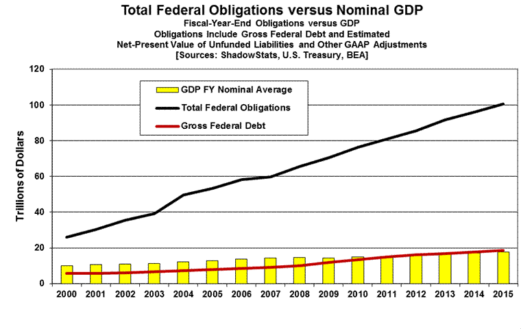 Summary details are reflected in the accompanying Graphs 1 to 3. Estimates for GAAP-based 2015 are subject to revision. The headline detail to be provided in the General Commentary will examine various approaches to measuring the unfunded liabilities of the federal government and how those approaches can impact the measurement of annual GAAP-based shortfalls. As standardly assessed here, fiscal year-end GAAP-based gross federal debt, combined with the net-present value of unfunded federal government liabilities, likely stood at about $100.5 trillion at fiscal year-end 2015, roughly 540% of the nominal U.S. GDP for fiscal 2015. That compares with a coincident gross federal debt to GDP ratio of about 104%.