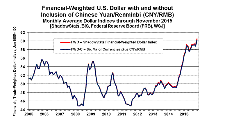 Presumably, respective global currency volume increasingly will reflect the renminbi’s new reserve status. Accordingly, it has been added to the ShadowStats Financial-Weighted U.S. Dollar, as plotted in Graphs 4 and 5. At present, the headline impact is barely noticeable, but that should change markedly in the year or two ahead.