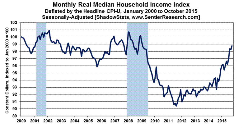 On a monthly basis, when headline GDP purportedly started its solid economic recovery in mid-2009, the monthly household income number nonetheless plunged to new lows. The August 2015 reading had recovered the lowest level seen during the formal recession, before backing off in September but notching higher again in October, but it remains below the pre-recession highs for both the formal 2007 and 2001 recessions.