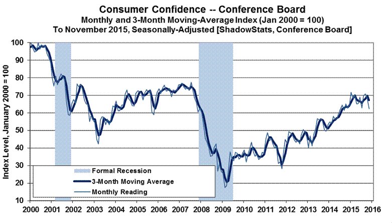 The Conference Board’s seasonally-adjusted [unadjusted data are not available] Consumer-Confidence Index (Graph 11) and the University of Michigan’s not-seasonally-adjusted Consumer-Sentiment Index (Graph 12) both declined for the full-month of November 2015, with Confidence down particularly sharply in the month. The early-December estimate for Sentiment, published today (December 11th) moved minimally higher subject to potentially meaningful revision at the end of the month. No early-month estimate for Confidence is published, but it always is subject to revision with the next month’s reporting.