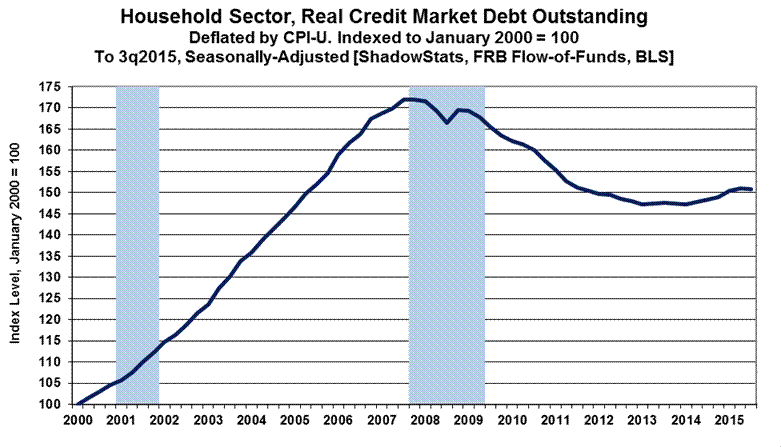 The series includes mortgages, automobile and student loans, credit cards, secured and unsecured loans, etc., all deflated by the headline CPI-U. The level of real debt outstanding has remained stagnant for several years, reflecting, among other issues, lack of normal lending by the banking system into the regular flow of commerce. Updated through third-quarter 2015, again the graph reflects the most-recent detail available.