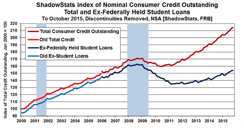 Shown through October 2015 reporting, Graph 15 of monthly Consumer Credit Outstanding is a subcomponent of Graph 14 on real Household Sector debt, but Graph 15 is not adjusted for inflation. Post-2008 Panic, outstanding consumer credit has continued to be dominated by growth in federally-held student loans, not in bank loans to consumers that otherwise would fuel broad consumption or housing growth. Although in slow uptrend, the nominal level of Consumer Credit Outstanding (ex-student loans) has not recovered since the onset of the recession. These disaggregated data are available and plotted only on a not-seasonally-adjusted basis, with October 2015 levels reflecting a broad slowing in the aggregate growth of consumer debt outstanding.