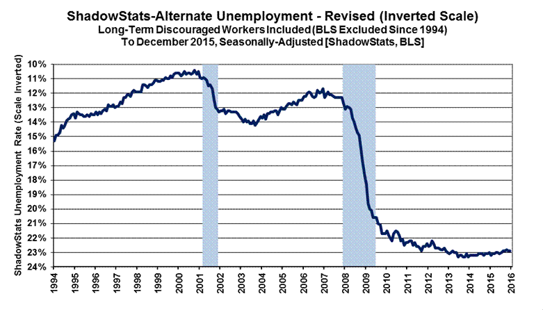 Adding back into the total unemployed and labor force the ShadowStats estimate of the ever-growing ranks of long-term discouraged workers (excluded from government unemployment calculations)—a broad unemployment measure more in line with common experience—the ShadowStats-Alternate Unemployment Estimate held at 22.9% in December 2015, up from a near-term low of 22.8% in October, and down from the series high of 23.3% in December 2013.