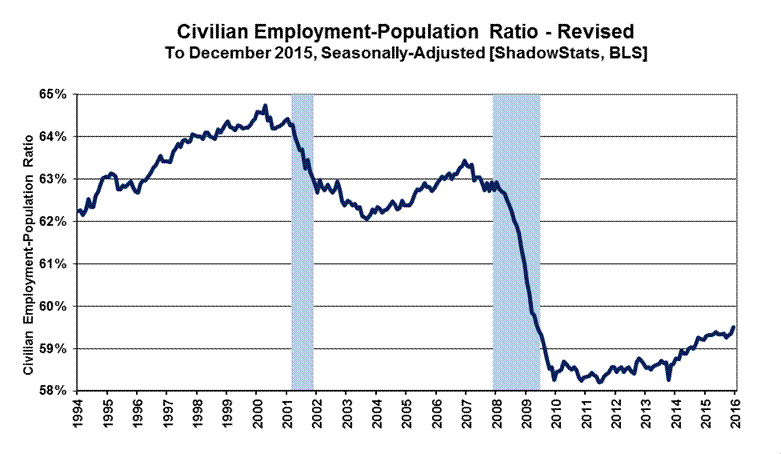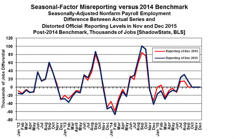 Household-Survey Revisions Were Unusually Minimal. The December 2015 annual Household–Survey revisions to five years of seasonally-adjusted data are reflected in all related numerical and graphic detail of this Commentary and in the updated database for U.3, U.6 and ShadowStats unemployment detail found in Alternate Unemployment on the Alternate Data tab at www.ShadowStats.com.