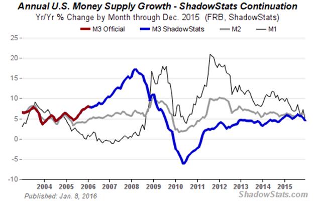 ShadowStats estimates annual growth in broad money supply M3 at 4.5% in December 2015, down from an unrevised 5.2% in November 2015, a revised 5.6% [previously 5.5%] in October 2015, a revised 5.7% [previously 5.6%] in September 2015 and an unrevised 6.0% in August 2015.