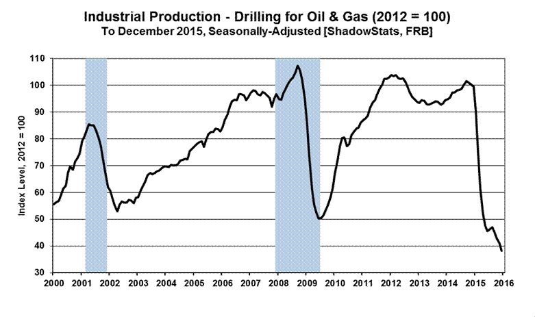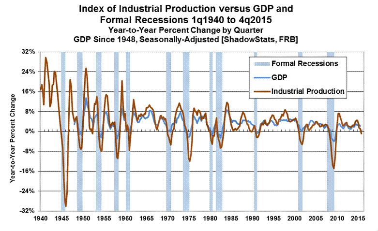 Separately, year-to-year growth in quarterly production continued to slow and now is in decline, ranging from a positive 3.47% in first-quarter 2015, to 1.45% in second-quarter 2015, to a downwardly revised 1.17% in third-quarter 2015, to an initial headline annual decline of 0.85% (-0.85%) in fourth-quarter 2015. Again, except in unusual circumstances such as national strikes, annual quarterly production growth does not contract outside of periods that eventually are declared formal recessions.