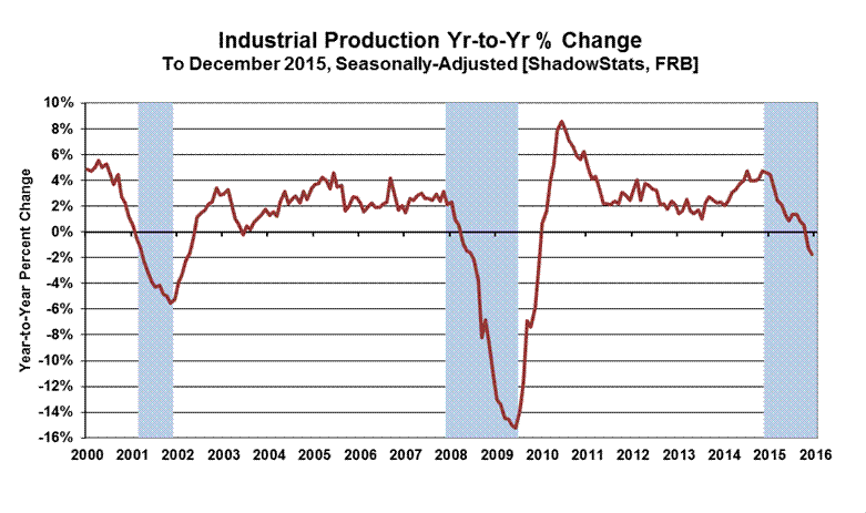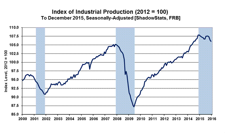 Increasing Recognition of an Unfolding “New” Recession in the Wake of Crashing Production Activity. With all major industry groups in consecutive headline, monthly contractions, with a worse-than-expected headline drop of 0.4% (-0.4%) in December 2015 industrial production, and in the context of a downwardly-revised monthly contraction of 0.9% (-0.9%) in November production, the consensus economic outlook appears to have been rattled a bit, with talk of a possible recession gaining some traction. On top of the collapsing monthly data, year-to-year change for December 2015 production fell by 1.8% (-1.8%), a level of contraction not seen in the post-World II era outside of formal recessions.