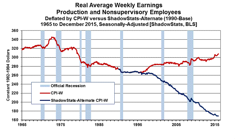Instead of being deflated by the CPI-U, the “corrected” real retail sales numbers—in Graph 2—use the ShadowStats-Alternate Inflation Measure (1990-Base) for deflation. With the higher inflation of the ShadowStats measure, the revamped numbers show a pattern of plunge and stagnation and renewed downturn, consistent with patterns seen in consumer indicators like real average weekly earnings (see Graph 3), broad unemployment series and in most housing statistics (see Commentary No. 779 and the accompany detail on December 2015 Housing Starts).