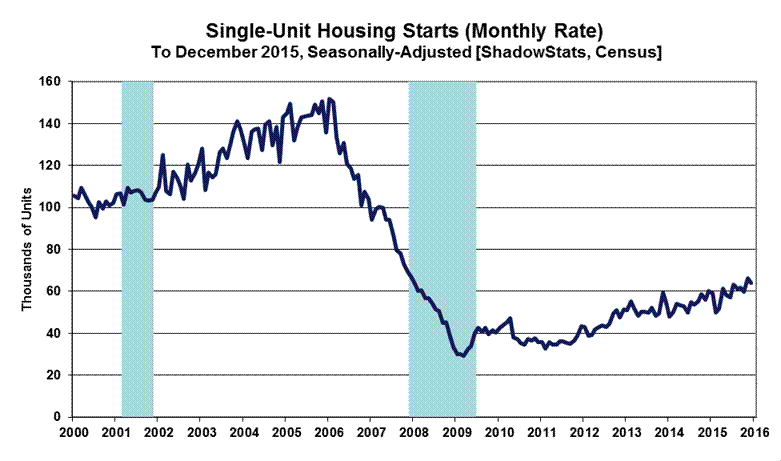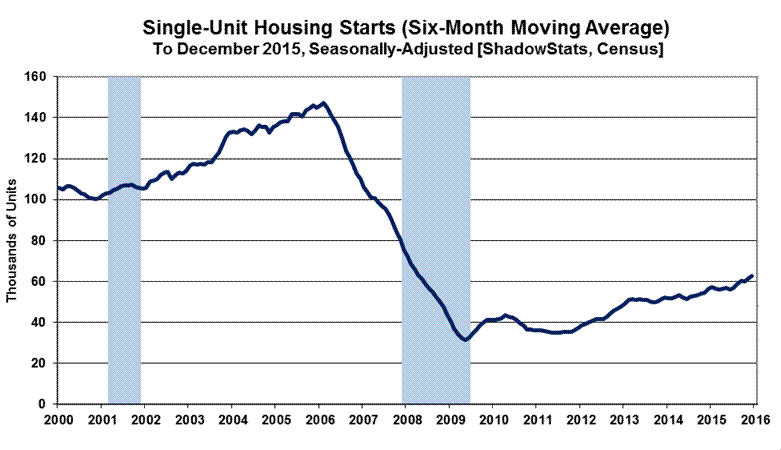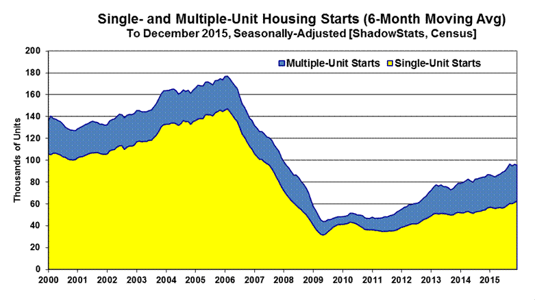 The record monthly low level of activity seen for the present aggregate series was in April 2009, where the annualized monthly pace of housing starts then was down 79% (-79%) from the January 2006 pre-recession peak. Against that downside-spiked low in April 2009, the December 2015 headline number was up by 140%, but it still was down by 49% (-49%) from the January 2006 pre-recession high for the series. Shown in the historical perspective of the post-World War II era, current aggregate-starts activity is in up-trending stagnation at low levels that otherwise have been at or near the historical troughs of recession activity of the last 70 years, as reflected in Graph 24 at the end of the Reporting Detail section.