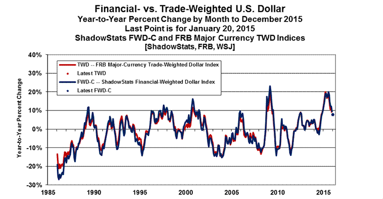 Separately, although the pace of annual CPI-U inflation in December rose to 0.73%, year-to-year inflation is not and has not been quite as soft as indicated by headline reporting, when considered in the context of traditional CPI reporting and common experience. The ShadowStats Alternate Inflation Measures rose in December to 4.3% annual inflation, based on 1990 methodologies, and to 8.4% annual inflation, based on 1980 methodologies.