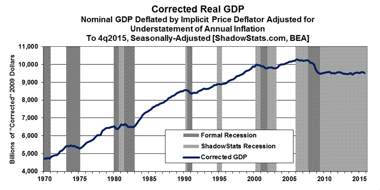 ShadowStats-Alternate GDP. The ShadowStats-Alternate GDP estimate for fourth-quarter 2015 GDP is a year-to-year contraction of 1.7% (-1.7%) versus the softening annual gain of 1.8% seen in the headline number. Such was against a ShadowStats estimate of a 1.4% (-1.4%) annul decline in third-quarter 2015, versus the official third-quarter GDP year-to-year gain of 2.1% (see the Alternate Data tab).