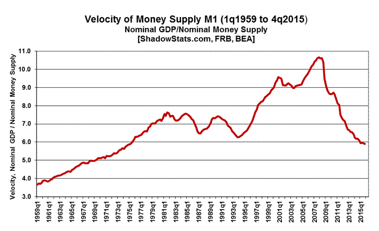 The Velocity of Money Slowed Minimally in Third-Quarter 2015. Incorporating the headline detail of nominal fourth-quarter 2015 GDP, as well as detail from the Federal Reserve annual benchmark revisions to money-supply-related data through fourth-quarter 2015 (published last night, January 28th), Graphs 8 and 9 show estimates of the velocity of money, broken out for money supply M1, M2 and M3 (the ShadowStats Ongoing-M3 Measure).