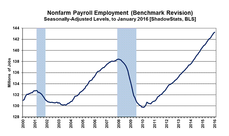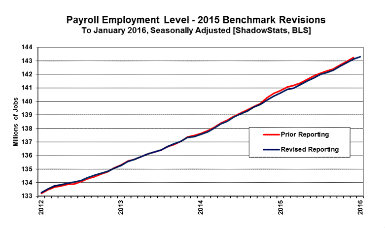 Downside Payroll Benchmark Revision Was as Promised. Five months ago, the Bureau of Labor Statistics (BLS) initially estimated a downside benchmark revision of 208,000 (-208,000) jobs for its base March 2015 payroll employment levels (see Commentary No. 753). Published February 5th, the headline downside revision to unadjusted March 2015 payroll employment was 206,000 (-206,000), with adjustments made to the headline detail going back to 2000 and forward to December 2015. The bulk of the changes to not-seasonally-adjusted data were made from October 2012 to date. The seasonally-adjusted numbers were revamped from January 2011 on, confirming the consistent patterns regularly corrected in ShadowStats missives.