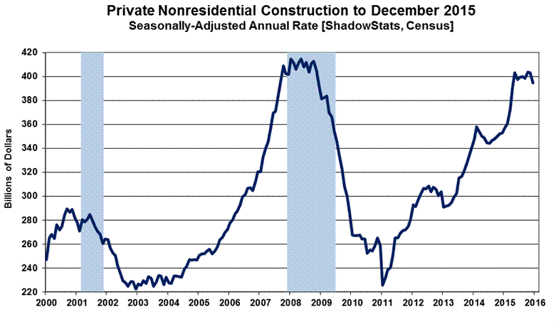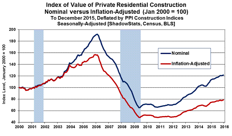 The pattern of non-recovered, inflation-adjusted activity here—net of government inflation estimates—does not confirm the economic recovery indicated by the headline GDP series (see prior Commentary No. 783 and No. 777 Year-End Special Commentary). To the contrary, the latest broad construction reporting, both before (nominal) and after (real) inflation adjustment, generally still shows a pattern of low-level activity, where activity never recovered pre-recession highs and has flattened-out anew, turning lower in fourth-quarter 2015.