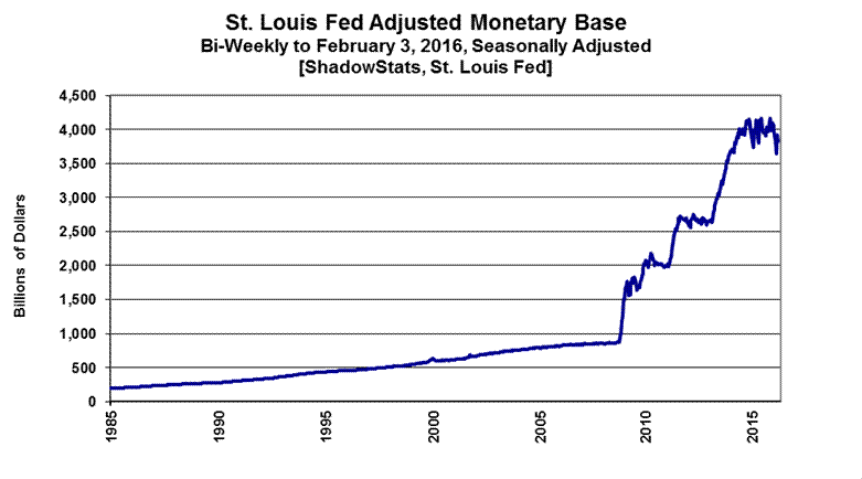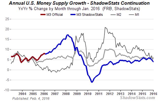 These circumstances follow the unusually-weak reporting of December 2015 new orders for durable goods on January 28th, which was too late for inclusion in the “advance” GDP estimate (see Commentary No. 782). Separately, shifting annual-growth patterns in the money supply have become suggestive of activity last seen heading into the economic collapse (see discussion in the Hyperinflation Watch).