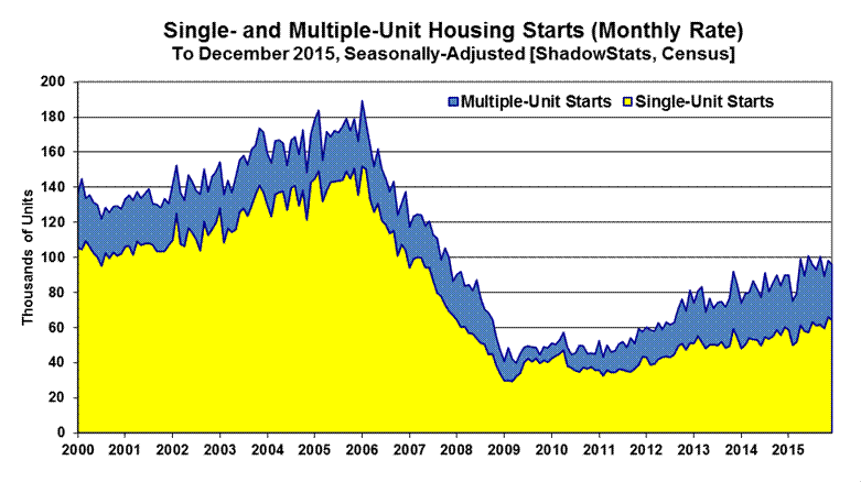 Adding back into the total unemployed and labor force the ShadowStats estimate of the ever-growing ranks of long-term discouraged workers (excluded from government unemployment calculations)—a broad unemployment measure more in line with common experience—the ShadowStats-Alternate Unemployment Estimate held at 22.9% in January 2016. That was unchanged from December 2015, and down from the series high of 23.3%, last seen in December 2013. The ShadowStats measure absorbs the long-term discouraged workers who pass through accounting for U.3 and U.6 unemployment measures within very limited time horizons.