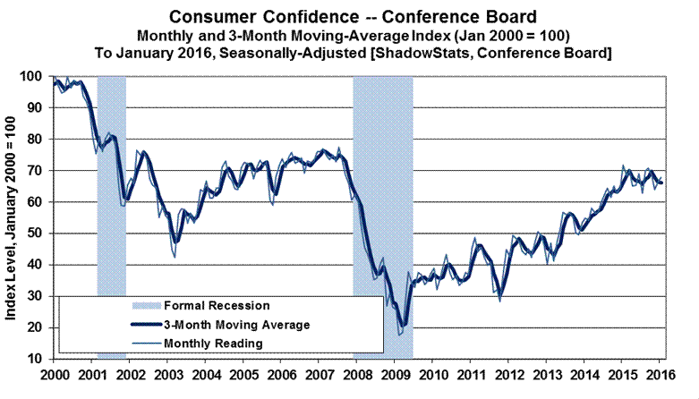 Continuing “Other” Confirmation of Non-Recovery and Renewed Downturn. Beyond the negative signals from today’s release of early-February 2016 Consumer Sentiment—discussed in the Consumer Liquidity update later in these Opening Comments—yesterday’s publication of the headline January 2016 Cass Freight Index™ suggested ongoing difficulties in the broad North American economy.