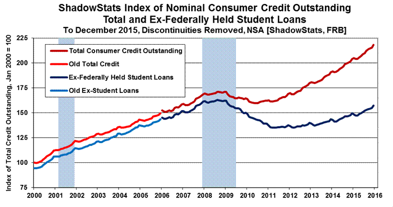 Consumer Credit Outstanding. Debt expansion can help make up for a shortfall in income growth. Shown in Graph 10, seasonal upticks again were seen both in student-loan activity as well as in total credit in the not-seasonally-adjusted Consumer Credit Outstanding series for December 2015. Not adjusted for inflation, post-2008 Panic, outstanding consumer credit has continued to be dominated by growth in federally-held student loans, not in bank loans to consumers that otherwise would fuel broad consumption or housing growth. Although in slow uptrend, the nominal level of Consumer Credit Outstanding (ex-student loans) has not recovered since the onset of the recession. These disaggregated data are available and plotted only on a not-seasonally-adjusted basis, with the December 2015 levels still reflecting a broad slowing in the aggregate growth of consumer debt outstanding (ex-student loans).