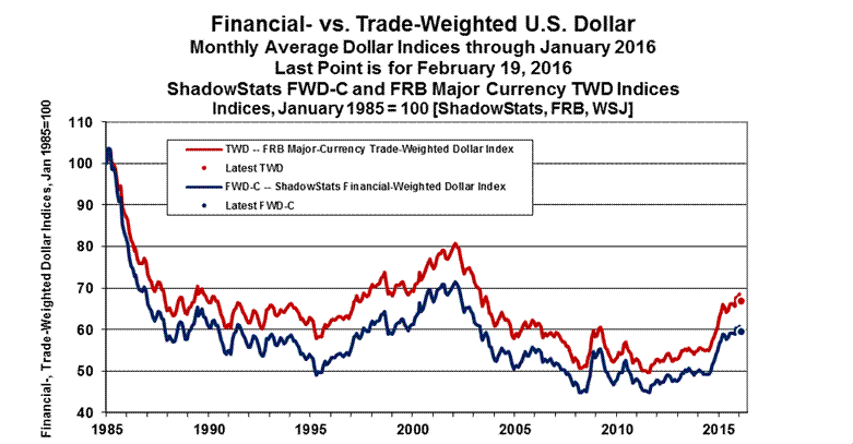 Separately, although the headline pace of January 2016 annual CPI-U inflation rose to 1.4%, year-to-year inflation is not and has not been quite as soft as indicated in headline reporting, when considered in the context of traditional CPI reporting and common experience. The ShadowStats Alternate Inflation Measures rose in January to 5.0% annual inflation, based on 1990 methodologies, and to 9.0% annual inflation, based on 1980 methodologies.